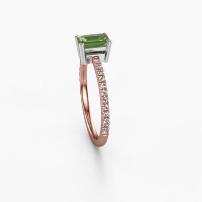 The ring shown above is called the Denita 2 EME. We call this type of ring a pavé solitaire ring because it has one centre gemstone and a band that is also pave set with gemstones. This engagement ring is made in 14 Carat rose gold set with a 6x4 mm emerald cut tourmaline green, and pave set diamonds at the sides. Each piece of jewellery is made just for you by our master goldsmiths in our own studio.This traditional rose gold pavé solitaire engagement ring has an exquisite emerald cut tourmaline green centre stone. To further accentuate the centre stone, the band is set full with more diamonds. Its open prong setting allows light to strike the tourmaline green from various angles and this adds sparkle to your tourmaline green ring. The photo shown above depicts the goldsmith's carefully handcrafted details of the ring. The high positioning of the centre stone is truly eye-catching. The perfect engagement ring for the crown jewel of your life!Are you on a budget? Please feel free to contact us, so we can go discuss your options. We offer our engagement rings at guaranteed best price, because we make them to order. You won't find such a price anywhere else!Our team adds new designs to our online collection daily. Our designers and goldsmiths work together in creating the best design. We strive to offer a diverse collection of jewels. Perhaps you have a specific jewel design in mind. One you came across somewhere. Please contact us for a free consultation. We will make you an offer, based on a fair price/ quality ratio, that will baffle you.To make it easier for you, we offer a 30 day return policy. Check our terms and conditions.