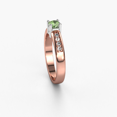 The ring shown above is called the Eline 2. We call this type of ring a pavé solitaire ring because it has one centre gemstone and a band that is also pave set with gemstones. The 14 Carat rose gold engagement ring is set with a round 3.7 mm tourmaline green centre stone and the band is pave set with diamond gemstones. Each jewel is unique in every way! Simply customize to your liking,This modern rose gold pavé solitaire engagement ring has an exquisite round tourmaline green centre stone. To further accentuate the centre stone, the band is fully set with more diamonds. Its open prong setting allows light to strike the tourmaline green from various angles and this adds sparkle to your tourmaline green ring. The photo shown above depicts the goldsmith's carefully handcrafted details of the ring. The high positioning of the centre stone is truly eye-catching. The perfect engagement ring for the crown jewel of your life! Because we design and deliver our own rings, we can offer you a engagement ring at a price you won't find anywhere else. A ring is made to order, which helps prevent excess supplies, so we can make you a great price offer. We understand it feels risky, buying your engagement ring online, but we will gladly assist in the designing process, taking your budget into consideration.Our team adds new designs to our online collection daily. Our designers and goldsmiths work together in creating the best design. We strive to offer a diverse collection of jewels. Perhaps you have a specific jewel design in mind. One you came across somewhere. Please contact us for a free consultation. We will make you an offer, based on a fair price/ quality ratio, that will baffle you.To make it easier for you, we offer a 30 day return policy. Check our terms and conditions.