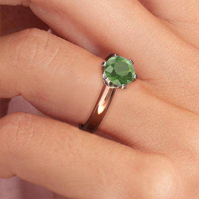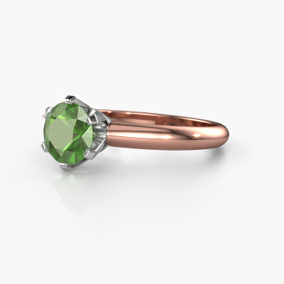 The ring shown above is called the Tiffy 1, we call this a solitaire ring because it contains a single gemstone. The engagement ring is made in 14 Carat rose gold and has a round tourmaline green of 7 mm. The cool thing about our configurator is that you can compile your own piece of jewellery, into a completely personalized one. This solitaire ring is crafted in the precious metals rose gold with white gold, but of course you are free to pick your own colours. Each piece of jewellery is made just for you, with attention to detail and design.The solitaire ring is a special type of engagement ring. Its open prong setting allows light to strike the gemstone from various angles. This classic engagement ring is a stunning eye-catcher because of the high positioning of the gemstone. In order for you to commemorate your proposal with a unique ring, we carefully adorn this solitaire ring by hand. The love of your life deserves nothing but the best. By using our modern techniques, we can design and customize the finest quality jewels with the utmost care for you. Our engagement rings are always priced 30 percent lower than other jewellers. We make engagement rings to order so we don't have to maintain a large stock. If you have a certain budget, we are more than happy to advice you accordingly.Our designers and goldsmiths work together each day, creating new jewels. Perhaps you have found a nice classic engagement ring somewhere, which can be used to customize your unique ring. Please feel free to contact us. We will make you an offer, based on a fair price/ quality ratio, which will amaze you.To make it easier for you, we offer a 30 day return policy. Check our terms and conditions.