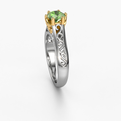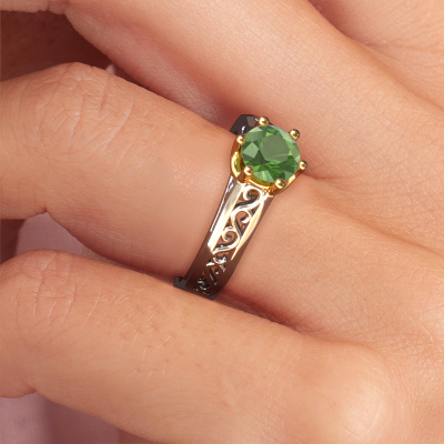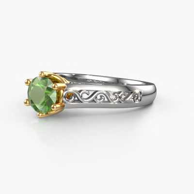 The ring shown above is called the Shan, we call this a solitaire ring because it contains a single gemstone. The engagement ring is made in 14 Carat white gold and has a round tourmaline green of 6 mm. The cool thing about our configurator is that you can compile your own piece of jewellery, into a completely personalized one. This solitaire ring is crafted in the precious metals white gold with gold, but of course you are free to pick your own colours. Each piece of jewellery is made by a team of passionate goldsmiths and jewel designers. This will make your crown jewel truly eye-catching.The solitaire ring is a special type of engagement ring. Its open prong setting allows light to strike the gemstone from various angles. This Celtic engagement ring is a stunning eye-catcher because of the high positioning of the gemstone. In order for you to commemorate your proposal with a unique ring, we carefully adorn this solitaire ring by hand. The love of your life deserves nothing but the best. By using our modern techniques, we can design and customize the finest quality jewels with the utmost care for you. Our engagement rings are always priced 30 percent lower than other jewellers. We make engagement rings to order so we don't have to maintain a large stock. If you have a certain budget, we are more than happy to advice you accordingly.Have you found a specific engagement ring somewhere which you would like to give to your loved one? Please feel free to express your wishes to our jewel designers because we would be honoured to turn your design into a Celtic engagement ring. You can follow the development of your ring design because we use 3D drawings. This gives you a realistic preview of how your design will look. You can also preorder a dummy. A dummy is a plastic ring, which can be shaped according your ring design. You can try it on and check if its width and size are suitable for you. We will gladly send you a non-binding offer, based on a fair price/ quality ratio. It will amaze you, considering the quality of the ring and gemstones.To make it easier for you, we offer a 30 day return policy. Check our terms and conditions.