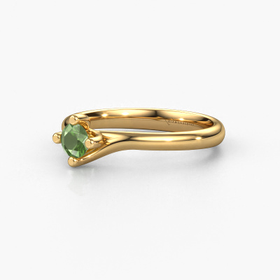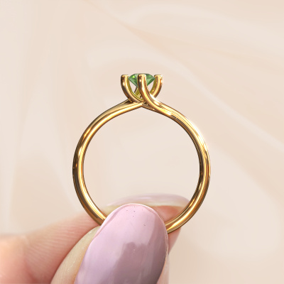 In your eyes, no one else compares to her. She is one in a million, unlike anyone else and pure? These qualities are emphasized perfectly by our modern gold solitaire tourmaline green ring. This tourmaline green is carefully selected by our keen artisan goldsmiths. It equals the unique qualities of the love of your life. There is no better way to memorialize your proposal than this symbol of true love. The ring shown above is called the Dewi Round, we call this a solitaire ring because it contains a single gemstone. The engagement ring is made in 14 Carat gold and has a round tourmaline green of 4 mm. Each piece of jewellery is made to shine bright around your finger. Each jewel is hand made with love by our goldsmiths.After receiving your order, our goldsmiths will passionately start the creative process of making your engagement ring in our own studio. Because we don't have a big stockpile, these costs will not be passed on to you. Our pricing is proof of that! We offer top quality jewels at lowest price, guaranteed.Different styles of new rings are made daily by our team. Perhaps you have found a solitaire engagement ring somewhere. One you would like to give to your loved one. Please feel free to share your thoughts and design with our jewel designers. We would love to turn your design into a modern engagement ring. You can follow the development of your ring design because we use very detailed 3D drawings. On top of that, you can order a dummy of the design. A dummy is a plastic ring, which can be shaped according your ring design. You can try it on and check if the engagement ring is up to standard. We will gladly send you a non-binding offer, based on a fair price/ quality ratio. The offer will baffle you, considering the quality of the ring and gemstones.To make it easier for you, we offer a 30 day return policy. Check our terms and conditions.