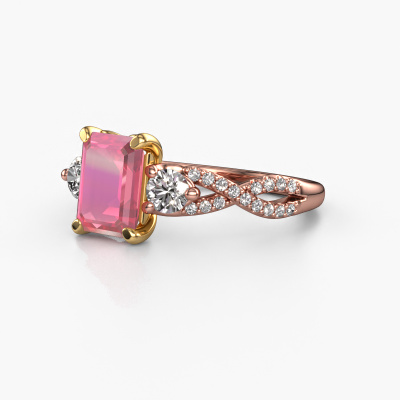 This 14 Carat rose gold ring is called Marilou EME and is set with tourmaline pink. How would you describe the style of the love of your life? Does she have a unique sense of style? This stunning split band rose gold engagement ring can be custom-made to your own or her liking. Our tourmaline pink gemstones have been carefully selected because we believe your luxury engagement ring must be adorned with nothing but the most beautiful gemstone. Don't you agree? This jewel is made to shine bright around your finger. Each jewel is hand made with love by our goldsmiths.After receiving your order, our goldsmiths will start the creative process of making your Marilou EME engagement ring. We don't keep stock. This is advantageous because these costs will not be passed on to you. Therefore, we can offer jewellery at exceptionally low prices.Do you have a specific ring in mind? One you came across somewhere. Please feel free to tell us your wishes and we will turn your design into a unique engagement ring. You can follow the development of your ring design because we use 3D drawings. This gives you a realistic preview of your design. We will gladly send you a non-binding offer, based on a fair price/ quality ratio. It will amaze you.To make it easier for you, we offer a 30 day return policy. Check our terms and conditions.