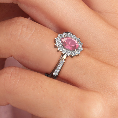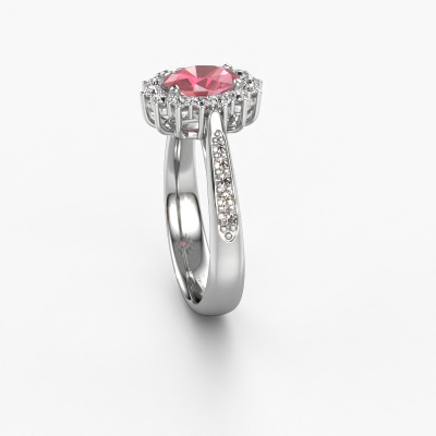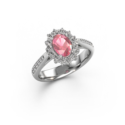 The ring shown above is called the Margien 2. We call this a Lady Diana ring. With an Lady Diana engagement ring, the larger centre gem is encircled by smaller side stones. This 14 Carat white gold ring is set with a 7x5 mm oval tourmaline pink gemstone, surrounded by smaller diamonds side stones. It's the most famous and celebrated engagement ring in the world; The Lady Diana ring. Exclusively meant for the most remarkable person in your life! A truly stunning aspect of this Lady Diana ring is its centre tourmaline pink. The smaller side stones embracing the tourmaline pink emphasize the sparkle of the centre gemstone, this makes it look as though they merge into one big gemstone. Due to its design, this is even more apparent in the Lady Di ring. Our expert Goldsmiths are keen to create a unique ring just for you. We can even customize the ring to your liking in our own crafting studio. This piece of jewellery is created to add sparkle to your finger, each jewel is lovingly made by hand by our goldsmiths.Are you on a budget? Please feel free to contact us, so we can go discuss your options. We offer our engagement rings at guaranteed best price, because we make them to order. You won't find such a price anywhere else!Our team adds new designs to our online collection daily. Our designers and goldsmiths work together in creating the best design. We strive to offer a diverse collection of jewels. Perhaps you have a specific jewel design in mind. One you came across somewhere. Please contact us for a free consultation. We will make you an offer, based on a fair price/ quality ratio, that will baffle you.To make it easier for you, we offer a 30 day return policy. Check our terms and conditions.