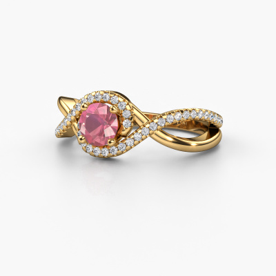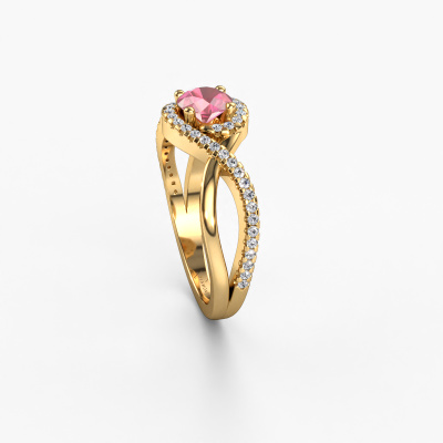 The ring shown above is called the Melody. We call this type of ring a pavé solitaire ring because it has one centre gemstone and a band that is also pave set with gemstones. This engagement ring is made in 14 Carat gold set with a 5 mm round tourmaline pink, and pave set diamonds at the sides. Each piece of jewellery is unique in every way! Simply customize to your likingThis classic gold pavé solitaire engagement ring has an exquisite round tourmaline pink centre stone. To further accentuate the centre stone, the band is set full with more diamonds. Its open prong setting allows light to strike the tourmaline pink from various angles and this adds sparkle to your tourmaline pink ring. The photo shown above depicts the goldsmith's carefully handcrafted details of the ring. The high positioning of the centre stone is truly eye-catching. The perfect engagement ring for the crown jewel of your life!Because we design and deliver our own rings, we can offer you a engagement ring at a price you won't find anywhere else. A ring is made to order, which helps prevent excess supplies, so we can make you a great price offer. We understand it feels risky, buying your engagement ring online, but we will gladly assist in the designing process, taking your budget into consideration.Do you have a specific ring in mind? One you came across somewhere. Please feel free to tell us your wishes and we will turn your design into a unique engagement ring. You can follow the development of your ring design because we use 3D drawings. This gives you a realistic preview of your design. We will gladly send you a non-binding offer, based on a fair price/ quality ratio. It will amaze you.To make it easier for you, we offer a 30 day return policy. Check our terms and conditions.