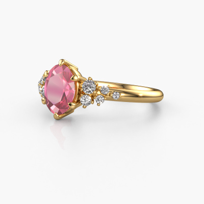 The ring shown above is called the Royce OVL. We call this type of ring a pavé solitaire ring because it has one centre gemstone and a band that is also pave set with gemstones. This engagement ring is made in 14 Carat gold set with a 8x6 mm oval tourmaline pink, and pave set lab-grown diamonds at the sides. Each piece of jewellery is made with passion and love by one of our master goldsmiths.This fantasy gold pavé solitaire engagement ring has an exquisite oval tourmaline pink centre stone. To further accentuate the centre stone, the band is set full with more lab-grown diamonds. Its open prong setting allows light to strike the tourmaline pink from various angles and this adds sparkle to your tourmaline pink ring. The photo shown above depicts the goldsmith's carefully handcrafted details of the ring. The high positioning of the centre stone is truly eye-catching. The perfect engagement ring for the crown jewel of your life!After receiving your order, our goldsmiths will passionately start the creative process of making your engagement ring in our own studio. Because we don't have a big stockpile, these costs will not be passed on to you. Our pricing is proof of that! We offer top quality jewels at lowest price, guaranteed.Have you found a specific engagement ring somewhere which you would like to give to your loved one? Please feel free to express your wishes to our jewel designers because we would be honoured to turn your design into a fantasy engagement ring. You can follow the development of your ring design because we use 3D drawings. This gives you a realistic preview of how your design will look. You can also preorder a dummy. A dummy is a plastic ring, which can be shaped according your ring design. You can try it on and check if its width and size are suitable for you. We will gladly send you a non-binding offer, based on a fair price/ quality ratio. It will amaze you, considering the quality of the ring and gemstones.To make it easier for you, we offer a 30 day return policy. Check our terms and conditions.