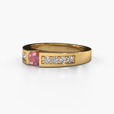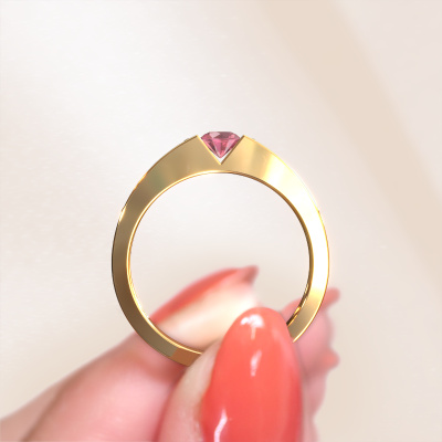The ring shown above is called the Lizzy 2. We call this type of ring a pavé solitaire ring because it has one centre gemstone and a band that is also pave set with gemstones. This engagement ring is made in 14 Carat gold set with a 4.2 mm round tourmaline pink, and pave set diamonds at the sides. Each piece of jewellery is made to shine bright around your finger. Each jewel is hand made with love by our goldsmiths.This modern gold pavé solitaire engagement ring has an exquisite round tourmaline pink centre stone. To further accentuate the centre stone, the band is set full with more diamonds. Its open prong setting allows light to strike the tourmaline pink from various angles and this adds sparkle to your tourmaline pink ring. The photo shown above depicts the goldsmith's carefully handcrafted details of the ring. The high positioning of the centre stone is truly eye-catching. The perfect engagement ring for the crown jewel of your life!By using a combination of the latest modern techniques, combined with ancient crafting, we can make all our engagement rings in our own studio. Each jewel is made to order. This is advantageous because we can offer you a price you won't find anywhere else.Our team adds new designs to our online collection daily. Our designers and goldsmiths work together in creating the best design. We strive to offer a diverse collection of jewels. Perhaps you have a specific jewel design in mind. One you came across somewhere. Please contact us for a free consultation. We will make you an offer, based on a fair price/ quality ratio, that will baffle you.To make it easier for you, we offer a 30 day return policy. Check our terms and conditions.