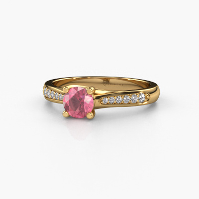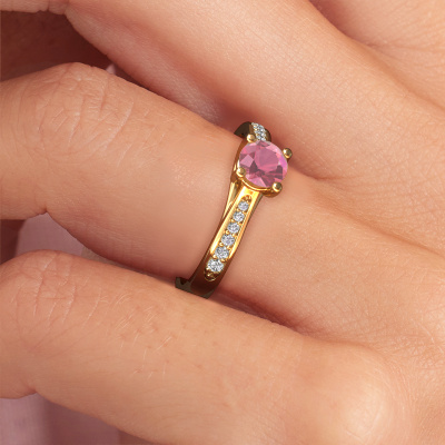 The ring shown above is called the Mia 2. We call this type of ring a pavé solitaire ring because it has one centre gemstone and a band that is also pave set with gemstones. This engagement ring is made in 14 Carat gold set with a 5 mm round tourmaline pink, and pave set lab-grown diamonds at the sides. Each piece of jewellery is made just for you, with attention to detail and design.This modern gold pavé solitaire engagement ring has an exquisite round tourmaline pink centre stone. To further accentuate the centre stone, the band is set full with more lab-grown diamonds. Its open prong setting allows light to strike the tourmaline pink from various angles and this adds sparkle to your tourmaline pink ring. The photo shown above depicts the goldsmith's carefully handcrafted details of the ring. The high positioning of the centre stone is truly eye-catching. The perfect engagement ring for the crown jewel of your life!By using our modern techniques, we can design and customize the finest quality jewels with the utmost care for you. Our engagement rings are always priced 30 percent lower than other jewellers. We make engagement rings to order so we don't have to maintain a large stock. If you have a certain budget, we are more than happy to advice you accordingly.Different styles of new rings are made daily by our team. Perhaps you have found a pavé solitaire engagement ring somewhere. One you would like to give to your loved one. Please feel free to share your thoughts and design with our jewel designers. We would love to turn your design into a modern engagement ring. You can follow the development of your ring design because we use very detailed 3D drawings. On top of that, you can order a dummy of the design. A dummy is a plastic ring, which can be shaped according your ring design. You can try it on and check if the engagement ring is up to standard. We will gladly send you a non-binding offer, based on a fair price/ quality ratio. The offer will baffle you, considering the quality of the ring and gemstones.To make it easier for you, we offer a 30 day return policy. Check our terms and conditions.