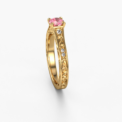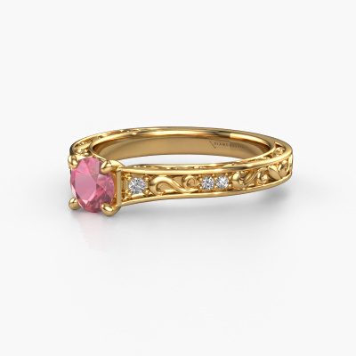 The ring shown above is called the Mallory rnd. We call this type of ring a pavé solitaire ring because it has one centre gemstone and a band that is also pave set with gemstones. This engagement ring is made in 14 Carat gold set with a 5 mm round tourmaline pink, and pave set lab-grown diamonds at the sides. Each piece of jewellery is made just for you by our master goldsmiths in our own studio.This vintage gold pavé solitaire engagement ring has an exquisite round tourmaline pink centre stone. To further accentuate the centre stone, the band is set full with more lab-grown diamonds. Its open prong setting allows light to strike the tourmaline pink from various angles and this adds sparkle to your tourmaline pink ring. The photo shown above depicts the goldsmith's carefully handcrafted details of the ring. The high positioning of the centre stone is truly eye-catching. The perfect engagement ring for the crown jewel of your life!Because we design and deliver our own rings, we can offer you a engagement ring at a price you won't find anywhere else. A ring is made to order, which helps prevent excess supplies, so we can make you a great price offer. We understand it feels risky, buying your engagement ring online, but we will gladly assist in the designing process, taking your budget into consideration.Different styles of new rings are made daily by our team. Perhaps you have found a pavé solitaire engagement ring somewhere. One you would like to give to your loved one. Please feel free to share your thoughts and design with our jewel designers. We would love to turn your design into a vintage engagement ring. You can follow the development of your ring design because we use very detailed 3D drawings. On top of that, you can order a dummy of the design. A dummy is a plastic ring, which can be shaped according your ring design. You can try it on and check if the engagement ring is up to standard. We will gladly send you a non-binding offer, based on a fair price/ quality ratio. The offer will baffle you, considering the quality of the ring and gemstones.To make it easier for you, we offer a 30 day return policy. Check our terms and conditions.