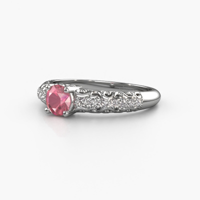 This platinum ring is called Mellie and is set with 5 mm tourmaline pink. What is it that makes your relationship unique? What is it about her that makes you want to bend down on one knee? The unique bond between the two of you is emphasized by an equally unique ring. A one of a kind filigree pavé solitaire engagement ring made especially for her. That is why this vintage ring fits her like a glove. Each specific detail of this filigree platinum tourmaline pink set engagement ring is hand-picked, crafted and polished by our expert goldsmith. The result is an exquisite ring, unique and perfectly crafted to perfection. That is what our expert Goldsmiths strive for. This jewel is made by a team of passionate goldsmiths and jewel designers. This will make your crown jewel truly eye-catching.Are you on a budget? Please feel free to contact us, so we can go discuss your options. We offer our engagement rings at guaranteed best price, because we make them to order. You won't find such a price anywhere else!Have you found a specific engagement ring somewhere which you would like to give to your loved one? Please feel free to express your wishes to our jewel designers because we would be honoured to turn your design into a vintage engagement ring. You can follow the development of your ring design because we use 3D drawings. This gives you a realistic preview of how your design will look. You can also preorder a dummy. A dummy is a plastic ring, which can be shaped according your ring design. You can try it on and check if its width and size are suitable for you. We will gladly send you a non-binding offer, based on a fair price/ quality ratio. It will amaze you, considering the quality of the ring and gemstones.To make it easier for you, we offer a 30 day return policy. Check our terms and conditions.