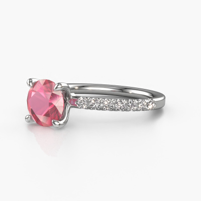 The ring shown above is called the Crystal RND 2. We call this type of ring a pavé solitaire ring because it has one centre gemstone and a band that is also pave set with gemstones. The platinum engagement ring is set with a round 7.3 mm tourmaline pink centre stone and the band is pave set with lab grown diamond gemstones. Each jewel is unique in every way! Simply customize to your liking,This classic platinum pavé solitaire engagement ring has an exquisite round tourmaline pink centre stone. To further accentuate the centre stone, the band is fully set with more lab-grown diamonds. Its open prong setting allows light to strike the tourmaline pink from various angles and this adds sparkle to your tourmaline pink ring. The photo shown above depicts the goldsmith's carefully handcrafted details of the ring. The high positioning of the centre stone is truly eye-catching. The perfect engagement ring for the crown jewel of your life! After receiving your order, our goldsmiths will start the creative process of making your Crystal RND 2 engagement ring. We don't keep stock. This is advantageous because these costs will not be passed on to you. Therefore, we can offer jewellery at exceptionally low prices.Different styles of new rings are made daily by our team. Perhaps you have found a pavé solitaire engagement ring somewhere. One you would like to give to your loved one. Please feel free to share your thoughts and design with our jewel designers. We would love to turn your design into a classic engagement ring. You can follow the development of your ring design because we use very detailed 3D drawings. On top of that, you can order a dummy of the design. A dummy is a plastic ring, which can be shaped according your ring design. You can try it on and check if the engagement ring is up to standard. We will gladly send you a non-binding offer, based on a fair price/ quality ratio. The offer will baffle you, considering the quality of the ring and gemstones.To make it easier for you, we offer a 30 day return policy. Check our terms and conditions.