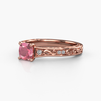 The ring shown above is called the Mallory cus. We call this type of ring a pavé solitaire ring because it has one centre gemstone and a band that is also pave set with gemstones. This engagement ring is made in 14 Carat rose gold set with a 5.5 mm cushion tourmaline pink, and pave set diamonds at the sides. Each piece of jewellery is made just for you by our master goldsmiths in our own studio.This Celtic rose gold pavé solitaire engagement ring has an exquisite cushion tourmaline pink centre stone. To further accentuate the centre stone, the band is set full with more diamonds. Its open prong setting allows light to strike the tourmaline pink from various angles and this adds sparkle to your tourmaline pink ring. The photo shown above depicts the goldsmith's carefully handcrafted details of the ring. The high positioning of the centre stone is truly eye-catching. The perfect engagement ring for the crown jewel of your life!By using our modern techniques, we can design and customize the finest quality jewels with the utmost care for you. Our engagement rings are always priced 30 percent lower than other jewellers. We make engagement rings to order so we don't have to maintain a large stock. If you have a certain budget, we are more than happy to advice you accordingly.Different styles of new rings are made daily by our team. Perhaps you have found a pavé solitaire engagement ring somewhere. One you would like to give to your loved one. Please feel free to share your thoughts and design with our jewel designers. We would love to turn your design into a Celtic engagement ring. You can follow the development of your ring design because we use very detailed 3D drawings. On top of that, you can order a dummy of the design. A dummy is a plastic ring, which can be shaped according your ring design. You can try it on and check if the engagement ring is up to standard. We will gladly send you a non-binding offer, based on a fair price/ quality ratio. The offer will baffle you, considering the quality of the ring and gemstones.To make it easier for you, we offer a 30 day return policy. Check our terms and conditions.
