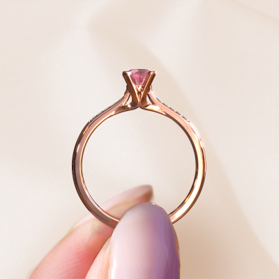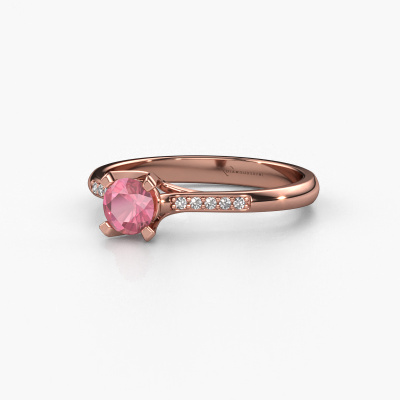 The ring shown above is called the Isa 2. We call this type of ring a pavé solitaire ring because it has one centre gemstone and a band that is also pave set with gemstones. This engagement ring is made in 14 Carat rose gold set with a 4.2 mm round tourmaline pink, and pave set diamonds at the sides. Each piece of jewellery is created to add sparkle to your finger, each jewel is lovingly made by hand by our goldsmiths.This classic rose gold pavé solitaire engagement ring has an exquisite round tourmaline pink centre stone. To further accentuate the centre stone, the band is set full with more diamonds. Its open prong setting allows light to strike the tourmaline pink from various angles and this adds sparkle to your tourmaline pink ring. The photo shown above depicts the goldsmith's carefully handcrafted details of the ring. The high positioning of the centre stone is truly eye-catching. The perfect engagement ring for the crown jewel of your life!After receiving your order, our goldsmiths will passionately start the creative process of making your engagement ring in our own studio. Because we don't have a big stockpile, these costs will not be passed on to you. Our pricing is proof of that! We offer top quality jewels at lowest price, guaranteed.Different styles of new rings are made daily by our team. Perhaps you have found a pavé solitaire engagement ring somewhere. One you would like to give to your loved one. Please feel free to share your thoughts and design with our jewel designers. We would love to turn your design into a classic engagement ring. You can follow the development of your ring design because we use very detailed 3D drawings. On top of that, you can order a dummy of the design. A dummy is a plastic ring, which can be shaped according your ring design. You can try it on and check if the engagement ring is up to standard. We will gladly send you a non-binding offer, based on a fair price/ quality ratio. The offer will baffle you, considering the quality of the ring and gemstones.To make it easier for you, we offer a 30 day return policy. Check our terms and conditions.