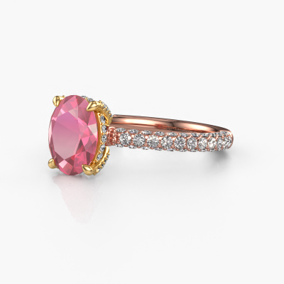 The ring shown above is called the Saskia 2 ovl. We call this type of ring a pavé solitaire ring because it has one centre gemstone and a band that is also pave set with gemstones. The 14 Carat rose gold engagement ring is set with a oval 9x7 mm tourmaline pink centre stone and the band is pave set with lab grown diamond gemstones. Each jewel is made just for you by our master goldsmiths in our own studio.This exclusive rose gold pavé solitaire engagement ring has an exquisite oval tourmaline pink centre stone. To further accentuate the centre stone, the band is fully set with more lab-grown diamonds. Its open prong setting allows light to strike the tourmaline pink from various angles and this adds sparkle to your tourmaline pink ring. The photo shown above depicts the goldsmith's carefully handcrafted details of the ring. The high positioning of the centre stone is truly eye-catching. The perfect engagement ring for the crown jewel of your life! After receiving your order, our goldsmiths will passionately start the creative process of making your engagement ring in our own studio. Because we don't have a big stockpile, these costs will not be passed on to you. Our pricing is proof of that! We offer top quality jewels at lowest price, guaranteed.Have you found a specific engagement ring somewhere which you would like to give to your loved one? Please feel free to express your wishes to our jewel designers because we would be honoured to turn your design into a exclusive engagement ring. You can follow the development of your ring design because we use 3D drawings. This gives you a realistic preview of how your design will look. You can also preorder a dummy. A dummy is a plastic ring, which can be shaped according your ring design. You can try it on and check if its width and size are suitable for you. We will gladly send you a non-binding offer, based on a fair price/ quality ratio. It will amaze you, considering the quality of the ring and gemstones.To make it easier for you, we offer a 30 day return policy. Check our terms and conditions.