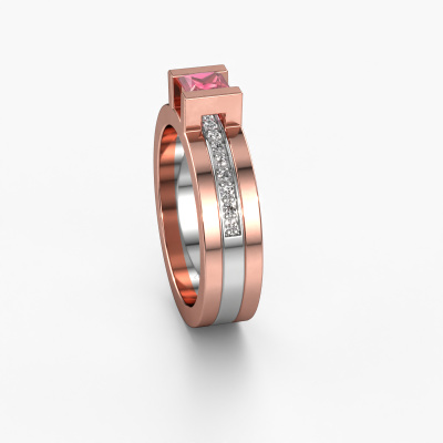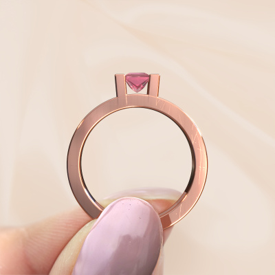 The ring shown above is called the Desire. We call this type of ring a pavé solitaire ring because it has one centre gemstone and a band that is also pave set with gemstones. The 14 Carat rose gold engagement ring is set with a princess 4 mm tourmaline pink centre stone and the band is pave set with diamond gemstones. Each jewel is made just for you by our master goldsmiths in our own studio.This modern rose gold pavé solitaire engagement ring has an exquisite princess tourmaline pink centre stone. To further accentuate the centre stone, the band is fully set with more diamonds. Its open prong setting allows light to strike the tourmaline pink from various angles and this adds sparkle to your tourmaline pink ring. The photo shown above depicts the goldsmith's carefully handcrafted details of the ring. The high positioning of the centre stone is truly eye-catching. The perfect engagement ring for the crown jewel of your life! By using a combination of the latest modern techniques, combined with ancient crafting, we can make all our engagement rings in our own studio. Each jewel is made to order. This is advantageous because we can offer you a price you won't find anywhere else.Have you found a specific engagement ring somewhere which you would like to give to your loved one? Please feel free to express your wishes to our jewel designers because we would be honoured to turn your design into a modern engagement ring. You can follow the development of your ring design because we use 3D drawings. This gives you a realistic preview of how your design will look. You can also preorder a dummy. A dummy is a plastic ring, which can be shaped according your ring design. You can try it on and check if its width and size are suitable for you. We will gladly send you a non-binding offer, based on a fair price/ quality ratio. It will amaze you, considering the quality of the ring and gemstones.To make it easier for you, we offer a 30 day return policy. Check our terms and conditions.
