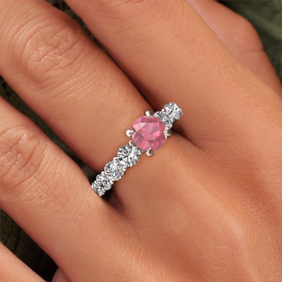 The ring shown above is called the Deja. We call this type of ring a pavé solitaire ring because it has one centre gemstone and a band that is also pave set with gemstones. This engagement ring is made in 14 Carat white gold set with a 6.5 mm round tourmaline pink, and pave set lab-grown diamonds at the sides. Each piece of jewellery is made just for you by our master goldsmiths in our own studio.This exclusive white gold pavé solitaire engagement ring has an exquisite round tourmaline pink centre stone. To further accentuate the centre stone, the band is set full with more lab-grown diamonds. Its open prong setting allows light to strike the tourmaline pink from various angles and this adds sparkle to your tourmaline pink ring. The photo shown above depicts the goldsmith's carefully handcrafted details of the ring. The high positioning of the centre stone is truly eye-catching. The perfect engagement ring for the crown jewel of your life!By using a combination of the latest modern techniques, combined with ancient crafting, we can make all our engagement rings in our own studio. Each jewel is made to order. This is advantageous because we can offer you a price you won't find anywhere else.Our team adds new designs to our online collection daily. Our designers and goldsmiths work together in creating the best design. We strive to offer a diverse collection of jewels. Perhaps you have a specific jewel design in mind. One you came across somewhere. Please contact us for a free consultation. We will make you an offer, based on a fair price/ quality ratio, that will baffle you.To make it easier for you, we offer a 30 day return policy. Check our terms and conditions.