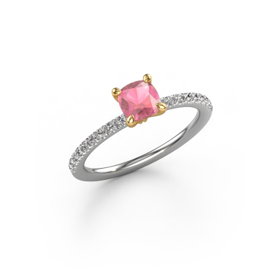 The ring shown above is called the Crystal CUS 2. We call this type of ring a pavé solitaire ring because it has one centre gemstone and a band that is also pave set with gemstones. The 14 Carat white gold engagement ring is set with a cushion 5 mm tourmaline pink centre stone and the band is pave set with diamond gemstones. Each jewel is made just for you by our master goldsmiths in our own studio.This classic white gold pavé solitaire engagement ring has an exquisite cushion tourmaline pink centre stone. To further accentuate the centre stone, the band is fully set with more diamonds. Its open prong setting allows light to strike the tourmaline pink from various angles and this adds sparkle to your tourmaline pink ring. The photo shown above depicts the goldsmith's carefully handcrafted details of the ring. The high positioning of the centre stone is truly eye-catching. The perfect engagement ring for the crown jewel of your life! After receiving your order, our goldsmiths will start the creative process of making your Crystal CUS 2 engagement ring. We don't keep stock. This is advantageous because these costs will not be passed on to you. Therefore, we can offer jewellery at exceptionally low prices.Different styles of new rings are made daily by our team. Perhaps you have found a pavé solitaire engagement ring somewhere. One you would like to give to your loved one. Please feel free to share your thoughts and design with our jewel designers. We would love to turn your design into a classic engagement ring. You can follow the development of your ring design because we use very detailed 3D drawings. On top of that, you can order a dummy of the design. A dummy is a plastic ring, which can be shaped according your ring design. You can try it on and check if the engagement ring is up to standard. We will gladly send you a non-binding offer, based on a fair price/ quality ratio. The offer will baffle you, considering the quality of the ring and gemstones.To make it easier for you, we offer a 30 day return policy. Check our terms and conditions.