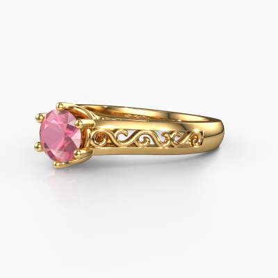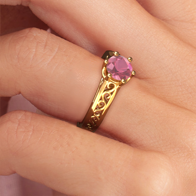 The ring shown above is called the Shan, we call this a solitaire ring because it contains a single gemstone. The engagement ring is made in 14 Carat gold and has a round tourmaline pink of 6 mm. The cool thing about our configurator is that you can compile your own piece of jewellery, into a completely personalized one. This solitaire ring is crafted in the precious metals gold with gold, but of course you are free to pick your own colours. Each piece of jewellery is made by a team of passionate goldsmiths and jewel designers. This will make your crown jewel truly eye-catching.The solitaire ring is a special type of engagement ring. Its open prong setting allows light to strike the gemstone from various angles. This Celtic engagement ring is a stunning eye-catcher because of the high positioning of the gemstone. In order for you to commemorate your proposal with a unique ring, we carefully adorn this solitaire ring by hand. The love of your life deserves nothing but the best. By using our modern techniques, we can design and customize the finest quality jewels with the utmost care for you. Our engagement rings are always priced 30 percent lower than other jewellers. We make engagement rings to order so we don't have to maintain a large stock. If you have a certain budget, we are more than happy to advice you accordingly.Have you found a specific engagement ring somewhere which you would like to give to your loved one? Please feel free to express your wishes to our jewel designers because we would be honoured to turn your design into a Celtic engagement ring. You can follow the development of your ring design because we use 3D drawings. This gives you a realistic preview of how your design will look. You can also preorder a dummy. A dummy is a plastic ring, which can be shaped according your ring design. You can try it on and check if its width and size are suitable for you. We will gladly send you a non-binding offer, based on a fair price/ quality ratio. It will amaze you, considering the quality of the ring and gemstones.To make it easier for you, we offer a 30 day return policy. Check our terms and conditions.