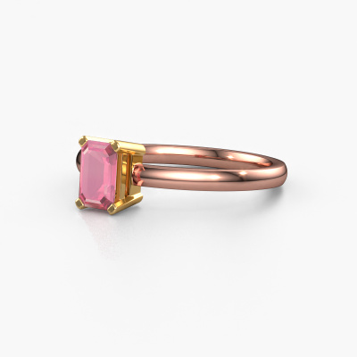 The ring shown above is called the Denita 1 EME, we call this a solitaire ring because it contains a single gemstone. The engagement ring is made in 14 Carat rose gold and has a emerald cut tourmaline pink of 6x4 mm. The cool thing about our configurator is that you can compile your own piece of jewellery, into a completely personalized one. This solitaire ring is crafted in the precious metals rose gold with gold, but of course you are free to pick your own colours. Each piece of jewellery is made by a team of passionate goldsmiths and jewel designers. This will make your crown jewel truly eye-catching.The solitaire ring is a special type of engagement ring. Its open prong setting allows light to strike the gemstone from various angles. This contemporary engagement ring is a stunning eye-catcher because of the high positioning of the gemstone. In order for you to commemorate your proposal with a unique ring, we carefully adorn this solitaire ring by hand. The love of your life deserves nothing but the best. By using a combination of the latest modern techniques, combined with ancient crafting, we can make all our engagement rings in our own studio. Each jewel is made to order. This is advantageous because we can offer you a price you won't find anywhere else.Our team adds new designs to our online collection daily. Our designers and goldsmiths work together in creating the best design. We strive to offer a diverse collection of jewels. Perhaps you have a specific jewel design in mind. One you came across somewhere. Please contact us for a free consultation. We will make you an offer, based on a fair price/ quality ratio, that will baffle you.To make it easier for you, we offer a 30 day return policy. Check our terms and conditions.