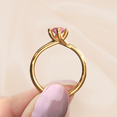 In your eyes, no one else compares to her. She is one in a million, unlike anyone else and pure? These qualities are emphasized perfectly by our modern gold solitaire tourmaline pink ring. This tourmaline pink is carefully selected by our keen artisan goldsmiths. It equals the unique qualities of the love of your life. There is no better way to memorialize your proposal than this symbol of true love. The ring shown above is called the Dewi Oval, we call this a solitaire ring because it contains a single gemstone. The engagement ring is made in 14 Carat gold and has a oval tourmaline pink of 7x5 mm. Each piece of jewellery is made with passion and love by one of our master goldsmiths.Are you on a budget? Please feel free to contact us, so we can go discuss your options. We offer our engagement rings at guaranteed best price, because we make them to order. You won't find such a price anywhere else!Do you have a specific ring in mind? One you came across somewhere. Please feel free to tell us your wishes and we will turn your design into a unique engagement ring. You can follow the development of your ring design because we use 3D drawings. This gives you a realistic preview of your design. We will gladly send you a non-binding offer, based on a fair price/ quality ratio. It will amaze you.To make it easier for you, we offer a 30 day return policy. Check our terms and conditions.