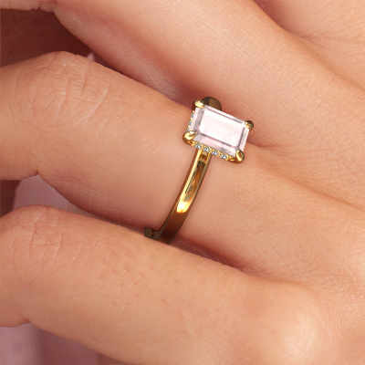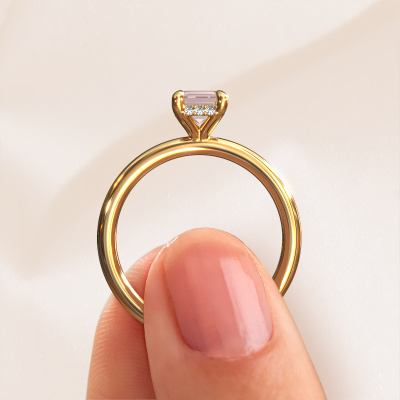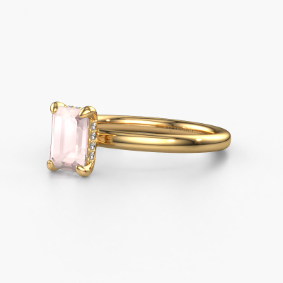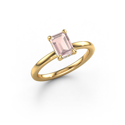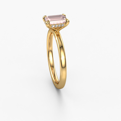 The ring shown above is called the Simone EME 2. We call this a solitaire ring because it contains a single gemstone. The engagement ring is made in 14 Carat gold and has a emerald cut morganite champagne of 7x5 mm. This extraordinary traditional gold solitaire engagement ring is set with a beautiful emerald cut morganite champagne to add sparkle to your proposal. The open prong setting allows light to strike the gemstone from various angles. Did you know a diamond represents everlasting love and fidelity? This makes it a perfect centrepiece. Our goldsmith carefully positions the gemstone of your choosing high on top of the ring, which makes it stand out. Each piece of jewellery is made by a team of passionate goldsmiths and jewel designers. This will make your crown jewel truly eye-catching.By using our modern techniques, we can design and customize the finest quality jewels with the utmost care for you. Our engagement rings are always priced 30 percent lower than other jewellers. We make engagement rings to order so we don't have to maintain a large stock. If you have a certain budget, we are more than happy to advice you accordingly.Do you have a specific ring in mind? One you came across somewhere. Please feel free to tell us your wishes and we will turn your design into a unique engagement ring. You can follow the development of your ring design because we use 3D drawings. This gives you a realistic preview of your design. We will gladly send you a non-binding offer, based on a fair price/ quality ratio. It will amaze you.To make it easier for you, we offer a 30 day return policy. Check our terms and conditions.