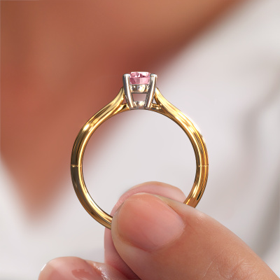 The ring shown above is called the Antonia rnd 1. We call this a solitaire ring because it contains a single gemstone. The engagement ring is made in 14 Carat gold and has a round pink lab grown diamond of 5 mm. This extraordinary traditional gold solitaire engagement ring is set with a beautiful round pink lab grown diamond to add sparkle to your proposal. The open prong setting allows light to strike the gemstone from various angles. Did you know a diamond represents everlasting love and fidelity? This makes it a perfect centrepiece. Our goldsmith carefully positions the gemstone of your choosing high on top of the ring, which makes it stand out. Each piece of jewellery is made just for you by our master goldsmiths in our own studio.Are you on a budget? Please feel free to contact us, so we can go discuss your options. We offer our engagement rings at guaranteed best price, because we make them to order. You won't find such a price anywhere else!Different styles of new rings are made daily by our team. Perhaps you have found a solitaire engagement ring somewhere. One you would like to give to your loved one. Please feel free to share your thoughts and design with our jewel designers. We would love to turn your design into a traditional engagement ring. You can follow the development of your ring design because we use very detailed 3D drawings. On top of that, you can order a dummy of the design. A dummy is a plastic ring, which can be shaped according your ring design. You can try it on and check if the engagement ring is up to standard. We will gladly send you a non-binding offer, based on a fair price/ quality ratio. The offer will baffle you, considering the quality of the ring and gemstones.To make it easier for you, we offer a 30 day return policy. Check our terms and conditions.