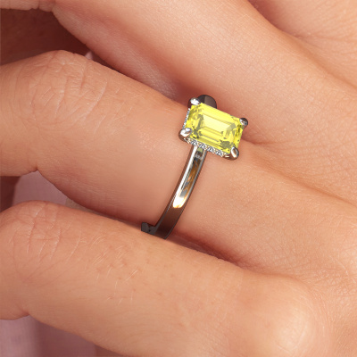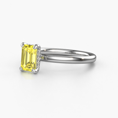 The ring shown above is called the Simone EME 2. We call this a solitaire ring because it contains a single gemstone. The engagement ring is made in platinum and has a emerald cut yellow lab grown diamond of 7x5 mm. This extraordinary traditional platinum solitaire engagement ring is set with a beautiful emerald cut yellow lab grown diamond to add sparkle to your proposal. The open prong setting allows light to strike the gemstone from various angles. Did you know a diamond represents everlasting love and fidelity? This makes it a perfect centrepiece. Our goldsmith carefully positions the gemstone of your choosing high on top of the ring, which makes it stand out. Each piece of jewellery is made by a team of passionate goldsmiths and jewel designers. This will make your crown jewel truly eye-catching.By using our modern techniques, we can design and customize the finest quality jewels with the utmost care for you. Our engagement rings are always priced 30 percent lower than other jewellers. We make engagement rings to order so we don't have to maintain a large stock. If you have a certain budget, we are more than happy to advice you accordingly.Do you have a specific ring in mind? One you came across somewhere. Please feel free to tell us your wishes and we will turn your design into a unique engagement ring. You can follow the development of your ring design because we use 3D drawings. This gives you a realistic preview of your design. We will gladly send you a non-binding offer, based on a fair price/ quality ratio. It will amaze you.To make it easier for you, we offer a 30 day return policy. Check our terms and conditions.