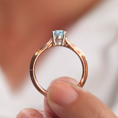 The ring shown above is called the Antonia rnd 1. We call this a solitaire ring because it contains a single gemstone. The engagement ring is made in 14 Carat rose gold and has a round blue lab grown diamond of 5 mm. This extraordinary traditional rose gold solitaire engagement ring is set with a beautiful round blue lab grown diamond to add sparkle to your proposal. The open prong setting allows light to strike the gemstone from various angles. Did you know a diamond represents everlasting love and fidelity? This makes it a perfect centrepiece. Our goldsmith carefully positions the gemstone of your choosing high on top of the ring, which makes it stand out. Each piece of jewellery is made just for you by our master goldsmiths in our own studio.Are you on a budget? Please feel free to contact us, so we can go discuss your options. We offer our engagement rings at guaranteed best price, because we make them to order. You won't find such a price anywhere else!Different styles of new rings are made daily by our team. Perhaps you have found a solitaire engagement ring somewhere. One you would like to give to your loved one. Please feel free to share your thoughts and design with our jewel designers. We would love to turn your design into a traditional engagement ring. You can follow the development of your ring design because we use very detailed 3D drawings. On top of that, you can order a dummy of the design. A dummy is a plastic ring, which can be shaped according your ring design. You can try it on and check if the engagement ring is up to standard. We will gladly send you a non-binding offer, based on a fair price/ quality ratio. The offer will baffle you, considering the quality of the ring and gemstones.To make it easier for you, we offer a 30 day return policy. Check our terms and conditions.