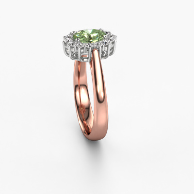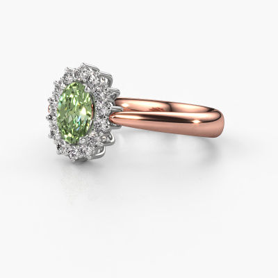 The ring shown above is called the Margien 1. We call this a Lady Diana ring. With an Lady Diana engagement ring, the larger centre gem is encircled by smaller side stones. This 14 Carat rose gold ring is set with a 7x5 mm oval green lab grown diamond gemstone, surrounded by smaller diamonds side stones. It's the most famous and celebrated engagement ring in the world; The Lady Diana ring. Exclusively meant for the most remarkable person in your life! A truly stunning aspect of this Lady Diana ring is its centre green lab grown diamond. The smaller side stones embracing the green lab grown diamond emphasize the sparkle of the centre gemstone, this makes it look as though they merge into one big gemstone. Due to its design, this is even more apparent in the Lady Di ring. Our expert Goldsmiths are keen to create a unique ring just for you. We can even customize the ring to your liking in our own crafting studio. This piece of jewellery is made just for you by our master goldsmiths in our own studio.After receiving your order, our goldsmiths will start the creative process of making your Margien 1 engagement ring. We don't keep stock. This is advantageous because these costs will not be passed on to you. Therefore, we can offer jewellery at exceptionally low prices.Our designers and goldsmiths work together each day, creating new jewels. Perhaps you have found a nice traditional engagement ring somewhere, which can be used to customize your unique ring. Please feel free to contact us. We will make you an offer, based on a fair price/ quality ratio, which will amaze you.To make it easier for you, we offer a 30 day return policy. Check our terms and conditions.