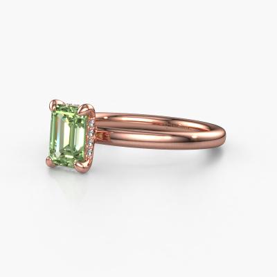 The ring shown above is called the Simone EME 2. We call this a solitaire ring because it contains a single gemstone. The engagement ring is made in 14 Carat rose gold and has a emerald cut green lab grown diamond of 7x5 mm. This extraordinary traditional rose gold solitaire engagement ring is set with a beautiful emerald cut green lab grown diamond to add sparkle to your proposal. The open prong setting allows light to strike the gemstone from various angles. Did you know a diamond represents everlasting love and fidelity? This makes it a perfect centrepiece. Our goldsmith carefully positions the gemstone of your choosing high on top of the ring, which makes it stand out. Each piece of jewellery is made by a team of passionate goldsmiths and jewel designers. This will make your crown jewel truly eye-catching.By using our modern techniques, we can design and customize the finest quality jewels with the utmost care for you. Our engagement rings are always priced 30 percent lower than other jewellers. We make engagement rings to order so we don't have to maintain a large stock. If you have a certain budget, we are more than happy to advice you accordingly.Do you have a specific ring in mind? One you came across somewhere. Please feel free to tell us your wishes and we will turn your design into a unique engagement ring. You can follow the development of your ring design because we use 3D drawings. This gives you a realistic preview of your design. We will gladly send you a non-binding offer, based on a fair price/ quality ratio. It will amaze you.To make it easier for you, we offer a 30 day return policy. Check our terms and conditions.
