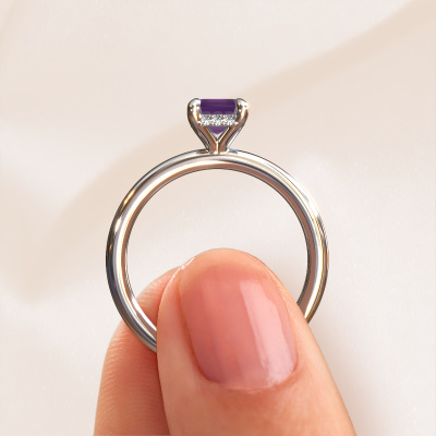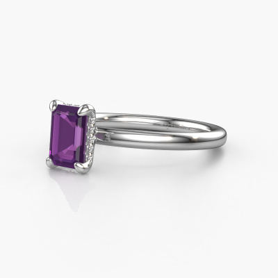 The ring shown above is called the Simone EME 2. We call this a solitaire ring because it contains a single gemstone. The engagement ring is made in 14 Carat white gold and has a emerald cut amethyst of 7x5 mm. This extraordinary traditional white gold solitaire engagement ring is set with a beautiful emerald cut amethyst to add sparkle to your proposal. The open prong setting allows light to strike the gemstone from various angles. Did you know a diamond represents everlasting love and fidelity? This makes it a perfect centrepiece. Our goldsmith carefully positions the gemstone of your choosing high on top of the ring, which makes it stand out. Each piece of jewellery is made by a team of passionate goldsmiths and jewel designers. This will make your crown jewel truly eye-catching.By using our modern techniques, we can design and customize the finest quality jewels with the utmost care for you. Our engagement rings are always priced 30 percent lower than other jewellers. We make engagement rings to order so we don't have to maintain a large stock. If you have a certain budget, we are more than happy to advice you accordingly.Do you have a specific ring in mind? One you came across somewhere. Please feel free to tell us your wishes and we will turn your design into a unique engagement ring. You can follow the development of your ring design because we use 3D drawings. This gives you a realistic preview of your design. We will gladly send you a non-binding offer, based on a fair price/ quality ratio. It will amaze you.To make it easier for you, we offer a 30 day return policy. Check our terms and conditions.