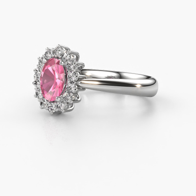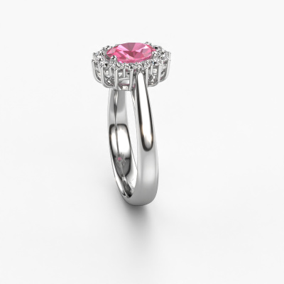 The ring shown above is called the Margien 1. We call this a Lady Diana ring. With an Lady Diana engagement ring, the larger centre gem is encircled by smaller side stones. This 14 Carat white gold ring is set with a 7x5 mm oval pink sapphire gemstone, surrounded by smaller diamonds side stones. It's the most famous and celebrated engagement ring in the world; The Lady Diana ring. Exclusively meant for the most remarkable person in your life! A truly stunning aspect of this Lady Diana ring is its centre pink sapphire. The smaller side stones embracing the pink sapphire emphasize the sparkle of the centre gemstone, this makes it look as though they merge into one big gemstone. Due to its design, this is even more apparent in the Lady Di ring. Our expert Goldsmiths are keen to create a unique ring just for you. We can even customize the ring to your liking in our own crafting studio. This piece of jewellery is made just for you by our master goldsmiths in our own studio.After receiving your order, our goldsmiths will start the creative process of making your Margien 1 engagement ring. We don't keep stock. This is advantageous because these costs will not be passed on to you. Therefore, we can offer jewellery at exceptionally low prices.Our designers and goldsmiths work together each day, creating new jewels. Perhaps you have found a nice traditional engagement ring somewhere, which can be used to customize your unique ring. Please feel free to contact us. We will make you an offer, based on a fair price/ quality ratio, which will amaze you.To make it easier for you, we offer a 30 day return policy. Check our terms and conditions.