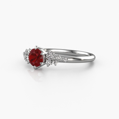 The ring shown above is called the Royce RND. We call this a solitaire ring because it contains a single gemstone. The engagement ring is made in 14 Carat white gold and has a round ruby of 5 mm. This extraordinary vintage white gold solitaire engagement ring is set with a beautiful round ruby to add sparkle to your proposal. The open prong setting allows light to strike the gemstone from various angles. Did you know a diamond represents everlasting love and fidelity? This makes it a perfect centrepiece. Our goldsmith carefully positions the gemstone of your choosing high on top of the ring, which makes it stand out. Each piece of jewellery is made by a team of passionate goldsmiths and jewel designers. This will make your crown jewel truly eye-catching.After receiving your order, our goldsmiths will passionately start the creative process of making your engagement ring in our own studio. Because we don't have a big stockpile, these costs will not be passed on to you. Our pricing is proof of that! We offer top quality jewels at lowest price, guaranteed.Do you have a specific ring in mind? One you came across somewhere. Please feel free to tell us your wishes and we will turn your design into a unique engagement ring. You can follow the development of your ring design because we use 3D drawings. This gives you a realistic preview of your design. We will gladly send you a non-binding offer, based on a fair price/ quality ratio. It will amaze you.To make it easier for you, we offer a 30 day return policy. Check our terms and conditions.