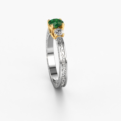 This 14 Carat white gold ring is called Betty 1 and is set with emerald. An extraordinary white gold vintage ring. One that will surely make the love of your life shine like a diamond! That is what we hope to achieve. This Celtic engagement ring is set with exquisite emerald. Whichever gemstone you choose from our selection, is up to you. The gemstone is selected with great care because we believe your engagement ring must be adorned with nothing but the most beautiful gemstone. Wouldn't you agree? Our expert goldsmith will design your ring in our own artisan studio, where the emerald will be set with great precision. The ring will then be polished till it is absolutely perfect. Nothing but the best for the love of your life! This jewel is created to add sparkle to your finger, each jewel is lovingly made by hand by our goldsmiths.Are you on a budget? Please feel free to contact us, so we can go discuss your options. We offer our engagement rings at guaranteed best price, because we make them to order. You won't find such a price anywhere else!Our team adds new designs to our online collection daily. Our designers and goldsmiths work together in creating the best design. We strive to offer a diverse collection of jewels. Perhaps you have a specific jewel design in mind. One you came across somewhere. Please contact us for a free consultation. We will make you an offer, based on a fair price/ quality ratio, that will baffle you.To make it easier for you, we offer a 30 day return policy. Check our terms and conditions.