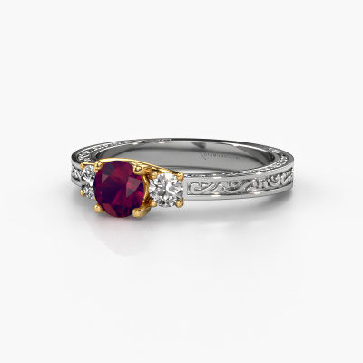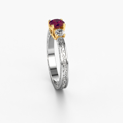 This 14 Carat white gold ring is called Betty 1 and is set with rhodolite. An extraordinary white gold vintage ring. One that will surely make the love of your life shine like a diamond! That is what we hope to achieve. This Celtic engagement ring is set with exquisite rhodolite. Whichever gemstone you choose from our selection, is up to you. The gemstone is selected with great care because we believe your engagement ring must be adorned with nothing but the most beautiful gemstone. Wouldn't you agree? Our expert goldsmith will design your ring in our own artisan studio, where the rhodolite will be set with great precision. The ring will then be polished till it is absolutely perfect. Nothing but the best for the love of your life! This jewel is created to add sparkle to your finger, each jewel is lovingly made by hand by our goldsmiths.Are you on a budget? Please feel free to contact us, so we can go discuss your options. We offer our engagement rings at guaranteed best price, because we make them to order. You won't find such a price anywhere else!Our team adds new designs to our online collection daily. Our designers and goldsmiths work together in creating the best design. We strive to offer a diverse collection of jewels. Perhaps you have a specific jewel design in mind. One you came across somewhere. Please contact us for a free consultation. We will make you an offer, based on a fair price/ quality ratio, that will baffle you.To make it easier for you, we offer a 30 day return policy. Check our terms and conditions.