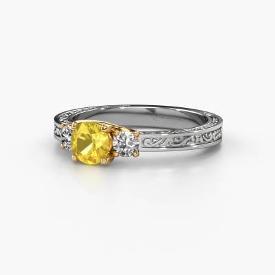 This 14 Carat white gold ring is called Betty 1 and is set with yellow sapphire. An extraordinary white gold vintage ring. One that will surely make the love of your life shine like a diamond! That is what we hope to achieve. This Celtic engagement ring is set with exquisite yellow sapphire. Whichever gemstone you choose from our selection, is up to you. The gemstone is selected with great care because we believe your engagement ring must be adorned with nothing but the most beautiful gemstone. Wouldn't you agree? Our expert goldsmith will design your ring in our own artisan studio, where the yellow sapphire will be set with great precision. The ring will then be polished till it is absolutely perfect. Nothing but the best for the love of your life! This jewel is created to add sparkle to your finger, each jewel is lovingly made by hand by our goldsmiths.Are you on a budget? Please feel free to contact us, so we can go discuss your options. We offer our engagement rings at guaranteed best price, because we make them to order. You won't find such a price anywhere else!Our team adds new designs to our online collection daily. Our designers and goldsmiths work together in creating the best design. We strive to offer a diverse collection of jewels. Perhaps you have a specific jewel design in mind. One you came across somewhere. Please contact us for a free consultation. We will make you an offer, based on a fair price/ quality ratio, that will baffle you.To make it easier for you, we offer a 30 day return policy. Check our terms and conditions.