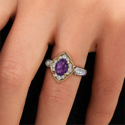 This 14 Carat white gold ring is called Rosan and is set with amethyst. An extraordinary white gold vintage ring. One that will surely make the love of your life shine like a diamond! That is what we hope to achieve. This vintage engagement ring is set with exquisite amethysten. Whichever gemstone you choose from our selection, is up to you. The gemstone is selected with great care because we believe your engagement ring must be adorned with nothing but the most beautiful gemstone. Wouldn't you agree? Our expert goldsmith will design your ring in our own artisan studio, where the amethyst will be set with great precision. The ring will then be polished till it is absolutely perfect. Nothing but the best for the love of your life! This jewel is made just for you by our master goldsmiths in our own studio.After receiving your order, our goldsmiths will passionately start the creative process of making your engagement ring in our own studio. Because we don't have a big stockpile, these costs will not be passed on to you. Our pricing is proof of that! We offer top quality jewels at lowest price, guaranteed.Our team adds new designs to our online collection daily. Our designers and goldsmiths work together in creating the best design. We strive to offer a diverse collection of jewels. Perhaps you have a specific jewel design in mind. One you came across somewhere. Please contact us for a free consultation. We will make you an offer, based on a fair price/ quality ratio, that will baffle you.To make it easier for you, we offer a 30 day return policy. Check our terms and conditions.