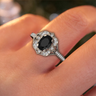 This 14 Carat white gold ring is called Loni and is set with 1.283 crt black diamond. This filigree white gold engagement ring is a true work of art! A beautifully adorned design of intricate wires. With dedication, patience and the utmost precision, our expert goldsmith will design a ring just for you. The adornment of small wiring is crafted to perfection by hand. It's a lengthy process which includes welding, crafting and polishing until our Goldsmiths are completely satisfied with the result: a perfect eye-catching ring that makes her shine with delight. Therefore the vintage filigree engagement ring is an extraordinary gift to bestow upon the love of your life. A handmade one-of-a-kind personalized ring, to be given to that special someone on that special moment when you pop the question. Isn't that wonderful? This piece of jewellery is made with passion and love by one of our master goldsmiths.Because we design and deliver our own rings, we can offer you a engagement ring at a price you won't find anywhere else. A ring is made to order, which helps prevent excess supplies, so we can make you a great price offer. We understand it feels risky, buying your engagement ring online, but we will gladly assist in the designing process, taking your budget into consideration.Our team adds new designs to our online collection daily. Our designers and goldsmiths work together in creating the best design. We strive to offer a diverse collection of jewels. Perhaps you have a specific jewel design in mind. One you came across somewhere. Please contact us for a free consultation. We will make you an offer, based on a fair price/ quality ratio, that will baffle you.To make it easier for you, we offer a 30 day return policy. Check our terms and conditions.