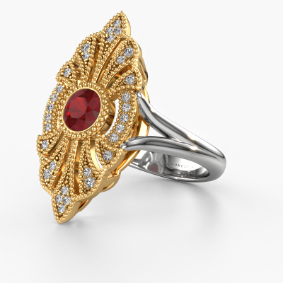 This 14 Carat white gold ring is called Hanna and is set with 5 mm ruby. This filigree white gold engagement ring is a true work of art! A beautifully adorned design of intricate wires. With dedication, patience and the utmost precision, our expert goldsmith will design a ring just for you. The adornment of small wiring is crafted to perfection by hand. It's a lengthy process which includes welding, crafting and polishing until our Goldsmiths are completely satisfied with the result: a perfect eye-catching ring that makes her shine with delight. Therefore the vintage filigree engagement ring is an extraordinary gift to bestow upon the love of your life. A handmade one-of-a-kind personalized ring, to be given to that special someone on that special moment when you pop the question. Isn't that wonderful? This piece of jewellery is created to add sparkle to your finger, each jewel is lovingly made by hand by our goldsmiths.After receiving your order, our goldsmiths will passionately start the creative process of making your engagement ring in our own studio. Because we don't have a big stockpile, these costs will not be passed on to you. Our pricing is proof of that! We offer top quality jewels at lowest price, guaranteed.Our team adds new designs to our online collection daily. Our designers and goldsmiths work together in creating the best design. We strive to offer a diverse collection of jewels. Perhaps you have a specific jewel design in mind. One you came across somewhere. Please contact us for a free consultation. We will make you an offer, based on a fair price/ quality ratio, that will baffle you.To make it easier for you, we offer a 30 day return policy. Check our terms and conditions.