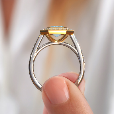 This 14 Carat white gold ring is called Noud 2 EME and is set with 8x6 mm blue lab grown diamond. Does your girlfriend fancy exclusive jewellery? Or would you like to show her that she deserves the finest jewellery? This white gold ring is pure craftsmanship, love and passion combined with the latest techniques coming together in perfect harmony. It requires a keen eye, patience and a skilful hand to mould this ring into perfection. Just the job for our expert goldsmith! The blue lab grown diamonds set gemstones gives this white gold ring an extra glamorous appearance. Customize the style of the pavé engagement ring to her liking with a wide variety of precious metals and gemstones which you select. That is how you create a unique ring for the most exclusive woman in your life! This jewel is created to add sparkle to your finger, each jewel is lovingly made by hand by our goldsmiths.After receiving your order, our goldsmiths will start the creative process of making your Noud 2 EME engagement ring. We don't keep stock. This is advantageous because these costs will not be passed on to you. Therefore, we can offer jewellery at exceptionally low prices.Have you found a specific engagement ring somewhere which you would like to give to your loved one? Please feel free to express your wishes to our jewel designers because we would be honoured to turn your design into a exclusive engagement ring. You can follow the development of your ring design because we use 3D drawings. This gives you a realistic preview of how your design will look. You can also preorder a dummy. A dummy is a plastic ring, which can be shaped according your ring design. You can try it on and check if its width and size are suitable for you. We will gladly send you a non-binding offer, based on a fair price/ quality ratio. It will amaze you, considering the quality of the ring and gemstones.To make it easier for you, we offer a 30 day return policy. Check our terms and conditions.