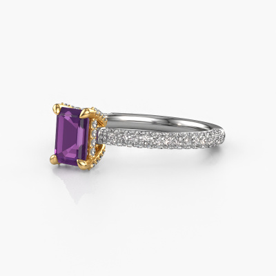 The ring shown above is called the Saskia eme 2. We call this type of ring a pavé solitaire ring because it has one centre gemstone and a band that is also pave set with gemstones. The 14 Carat white gold engagement ring is set with a emerald cut 6.5x4.5 mm amethyst centre stone and the band is pave set with diamond gemstones. Each jewel is made by a team of passionate goldsmiths and jewel designers. This will make your crown jewel truly eye-catching.This exclusive white gold pavé solitaire engagement ring has an exquisite emerald cut amethyst centre stone. To further accentuate the centre stone, the band is fully set with more diamonds. Its open prong setting allows light to strike the amethyst from various angles and this adds sparkle to your amethyst ring. The photo shown above depicts the goldsmith's carefully handcrafted details of the ring. The high positioning of the centre stone is truly eye-catching. The perfect engagement ring for the crown jewel of your life! By using our modern techniques, we can design and customize the finest quality jewels with the utmost care for you. Our engagement rings are always priced 30 percent lower than other jewellers. We make engagement rings to order so we don't have to maintain a large stock. If you have a certain budget, we are more than happy to advice you accordingly.Different styles of new rings are made daily by our team. Perhaps you have found a pavé solitaire engagement ring somewhere. One you would like to give to your loved one. Please feel free to share your thoughts and design with our jewel designers. We would love to turn your design into a exclusive engagement ring. You can follow the development of your ring design because we use very detailed 3D drawings. On top of that, you can order a dummy of the design. A dummy is a plastic ring, which can be shaped according your ring design. You can try it on and check if the engagement ring is up to standard. We will gladly send you a non-binding offer, based on a fair price/ quality ratio. The offer will baffle you, considering the quality of the ring and gemstones.To make it easier for you, we offer a 30 day return policy. Check our terms and conditions.