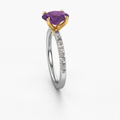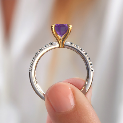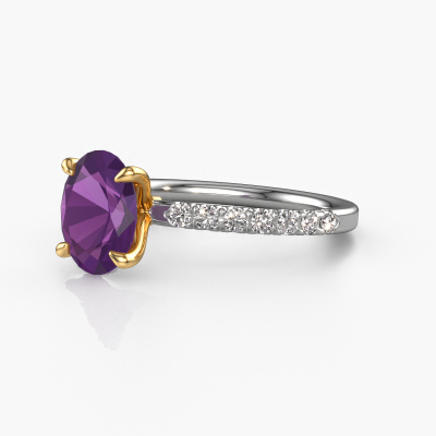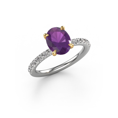 The ring shown above is called the Crystal OVL 2. We call this type of ring a pavé solitaire ring because it has one centre gemstone and a band that is also pave set with gemstones. The 14 Carat white gold engagement ring is set with a oval 9x7 mm amethyst centre stone and the band is pave set with lab grown diamond gemstones. Each jewel is made just for you by our master goldsmiths in our own studio.This exclusive white gold pavé solitaire engagement ring has an exquisite oval amethyst centre stone. To further accentuate the centre stone, the band is fully set with more lab-grown diamonds. Its open prong setting allows light to strike the amethyst from various angles and this adds sparkle to your amethyst ring. The photo shown above depicts the goldsmith's carefully handcrafted details of the ring. The high positioning of the centre stone is truly eye-catching. The perfect engagement ring for the crown jewel of your life! By using a combination of the latest modern techniques, combined with ancient crafting, we can make all our engagement rings in our own studio. Each jewel is made to order. This is advantageous because we can offer you a price you won't find anywhere else.Our team adds new designs to our online collection daily. Our designers and goldsmiths work together in creating the best design. We strive to offer a diverse collection of jewels. Perhaps you have a specific jewel design in mind. One you came across somewhere. Please contact us for a free consultation. We will make you an offer, based on a fair price/ quality ratio, that will baffle you.To make it easier for you, we offer a 30 day return policy. Check our terms and conditions.