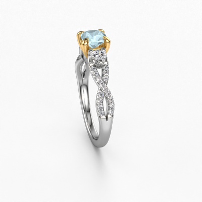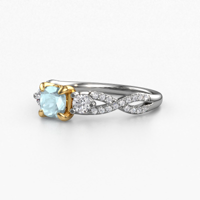 The ring shown above is called the Marilou CUS. We call this type of ring a 3-stone ring because it has one centre gemstone and a band that is also pave set with gemstones. The 14 Carat white gold engagement ring is set with a cushion 5 mm aquamarine centre stone and the band is pave set with diamond gemstones. Each jewel is unique in every way! Simply customize to your liking,This traditional white gold 3-stone engagement ring has an exquisite cushion aquamarine centre stone. To further accentuate the centre stone, the band is fully set with more diamonds. Its open prong setting allows light to strike the aquamarine from various angles and this adds sparkle to your aquamarine ring. The photo shown above depicts the goldsmith's carefully handcrafted details of the ring. The high positioning of the centre stone is truly eye-catching. The perfect engagement ring for the crown jewel of your life! By using a combination of the latest modern techniques, combined with ancient crafting, we can make all our engagement rings in our own studio. Each jewel is made to order. This is advantageous because we can offer you a price you won't find anywhere else.Our team adds new designs to our online collection daily. Our designers and goldsmiths work together in creating the best design. We strive to offer a diverse collection of jewels. Perhaps you have a specific jewel design in mind. One you came across somewhere. Please contact us for a free consultation. We will make you an offer, based on a fair price/ quality ratio, that will baffle you.To make it easier for you, we offer a 30 day return policy. Check our terms and conditions.
