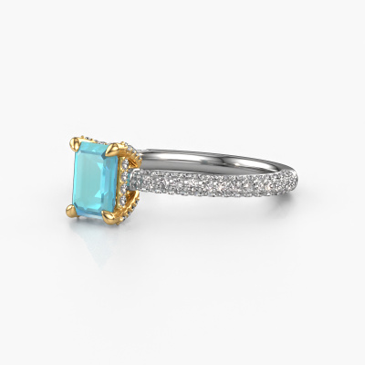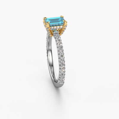 The ring shown above is called the Saskia eme 2. We call this type of ring a pavé solitaire ring because it has one centre gemstone and a band that is also pave set with gemstones. The 14 Carat white gold engagement ring is set with a emerald cut 6.5x4.5 mm blue topaz centre stone and the band is pave set with diamond gemstones. Each jewel is made by a team of passionate goldsmiths and jewel designers. This will make your crown jewel truly eye-catching.This exclusive white gold pavé solitaire engagement ring has an exquisite emerald cut blue topaz centre stone. To further accentuate the centre stone, the band is fully set with more diamonds. Its open prong setting allows light to strike the blue topaz from various angles and this adds sparkle to your blue topaz ring. The photo shown above depicts the goldsmith's carefully handcrafted details of the ring. The high positioning of the centre stone is truly eye-catching. The perfect engagement ring for the crown jewel of your life! By using our modern techniques, we can design and customize the finest quality jewels with the utmost care for you. Our engagement rings are always priced 30 percent lower than other jewellers. We make engagement rings to order so we don't have to maintain a large stock. If you have a certain budget, we are more than happy to advice you accordingly.Different styles of new rings are made daily by our team. Perhaps you have found a pavé solitaire engagement ring somewhere. One you would like to give to your loved one. Please feel free to share your thoughts and design with our jewel designers. We would love to turn your design into a exclusive engagement ring. You can follow the development of your ring design because we use very detailed 3D drawings. On top of that, you can order a dummy of the design. A dummy is a plastic ring, which can be shaped according your ring design. You can try it on and check if the engagement ring is up to standard. We will gladly send you a non-binding offer, based on a fair price/ quality ratio. The offer will baffle you, considering the quality of the ring and gemstones.To make it easier for you, we offer a 30 day return policy. Check our terms and conditions.