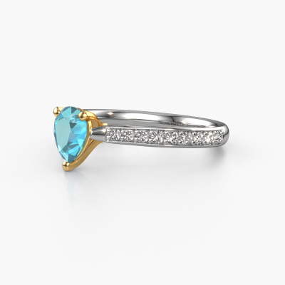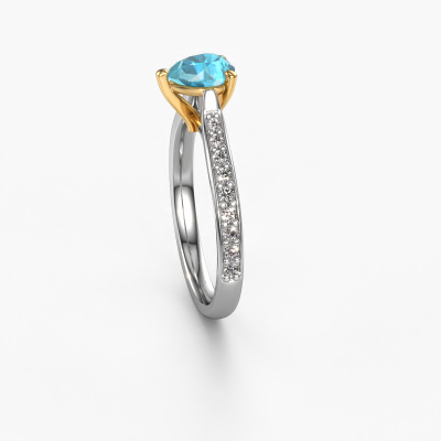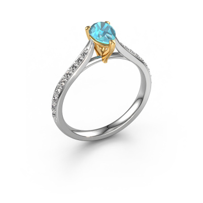 The ring shown above is called the Mignon per 2. We call this type of ring a pavé solitaire ring because it has one centre gemstone and a band that is also pave set with gemstones. The 14 Carat white gold engagement ring is set with a pear 6.5x4.5 mm blue topaz centre stone and the band is pave set with diamond gemstones. Each jewel is made just for you by our master goldsmiths in our own studio.This trendy white gold pavé solitaire engagement ring has an exquisite pear blue topaz centre stone. To further accentuate the centre stone, the band is fully set with more diamonds. Its open prong setting allows light to strike the blue topaz from various angles and this adds sparkle to your blue topaz ring. The photo shown above depicts the goldsmith's carefully handcrafted details of the ring. The high positioning of the centre stone is truly eye-catching. The perfect engagement ring for the crown jewel of your life! Are you on a budget? Please feel free to contact us, so we can go discuss your options. We offer our engagement rings at guaranteed best price, because we make them to order. You won't find such a price anywhere else!Our team adds new designs to our online collection daily. Our designers and goldsmiths work together in creating the best design. We strive to offer a diverse collection of jewels. Perhaps you have a specific jewel design in mind. One you came across somewhere. Please contact us for a free consultation. We will make you an offer, based on a fair price/ quality ratio, that will baffle you.To make it easier for you, we offer a 30 day return policy. Check our terms and conditions.