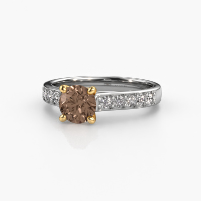 The ring shown above is called the Valorie RND 2. We call this type of ring a pavé solitaire ring because it has one centre gemstone and a band that is also pave set with gemstones. The 14 Carat white gold engagement ring is set with a round 1.00 crt brown diamond centre stone and the band is pave set with lab grown diamond gemstones. Each jewel is made just for you, with attention to detail and design.This modern white gold pavé solitaire engagement ring has an exquisite round brown diamond centre stone. To further accentuate the centre stone, the band is fully set with more lab-grown diamonds. Its open prong setting allows light to strike the brown diamond from various angles and this adds sparkle to your brown diamond ring. The photo shown above depicts the goldsmith's carefully handcrafted details of the ring. The high positioning of the centre stone is truly eye-catching. The perfect engagement ring for the crown jewel of your life! By using our modern techniques, we can design and customize the finest quality jewels with the utmost care for you. Our engagement rings are always priced 30 percent lower than other jewellers. We make engagement rings to order so we don't have to maintain a large stock. If you have a certain budget, we are more than happy to advice you accordingly.Our designers and goldsmiths work together each day, creating new jewels. Perhaps you have found a nice modern engagement ring somewhere, which can be used to customize your unique ring. Please feel free to contact us. We will make you an offer, based on a fair price/ quality ratio, which will amaze you.To make it easier for you, we offer a 30 day return policy. Check our terms and conditions.
