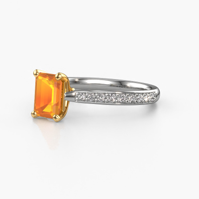 The ring shown above is called the Mignon eme 2. We call this type of ring a pavé solitaire ring because it has one centre gemstone and a band that is also pave set with gemstones. The 14 Carat white gold engagement ring is set with a emerald cut 7x5 mm citrin centre stone and the band is pave set with lab grown diamond gemstones. Each jewel is made just for you, with attention to detail and design.This exclusive white gold pavé solitaire engagement ring has an exquisite emerald cut citrin centre stone. To further accentuate the centre stone, the band is fully set with more lab-grown diamonds. Its open prong setting allows light to strike the citrin from various angles and this adds sparkle to your citrin ring. The photo shown above depicts the goldsmith's carefully handcrafted details of the ring. The high positioning of the centre stone is truly eye-catching. The perfect engagement ring for the crown jewel of your life! Are you on a budget? Please feel free to contact us, so we can go discuss your options. We offer our engagement rings at guaranteed best price, because we make them to order. You won't find such a price anywhere else!Do you have a specific ring in mind? One you came across somewhere. Please feel free to tell us your wishes and we will turn your design into a unique engagement ring. You can follow the development of your ring design because we use 3D drawings. This gives you a realistic preview of your design. We will gladly send you a non-binding offer, based on a fair price/ quality ratio. It will amaze you.To make it easier for you, we offer a 30 day return policy. Check our terms and conditions.