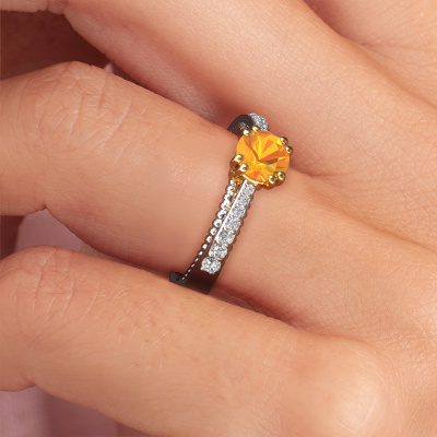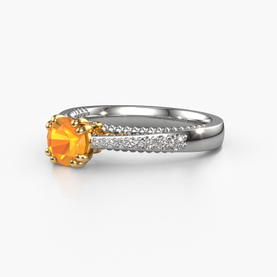 The ring shown above is called the Rozella. We call this type of ring a pavé solitaire ring because it has one centre gemstone and a band that is also pave set with gemstones. The 14 Carat white gold engagement ring is set with a round 5.5 mm citrin centre stone and the band is pave set with lab grown diamond gemstones. Each jewel is made to shine bright around your finger. Each jewel is hand made with love by our goldsmiths.This unique white gold pavé solitaire engagement ring has an exquisite round citrin centre stone. To further accentuate the centre stone, the band is fully set with more lab-grown diamonds. Its open prong setting allows light to strike the citrin from various angles and this adds sparkle to your citrin ring. The photo shown above depicts the goldsmith's carefully handcrafted details of the ring. The high positioning of the centre stone is truly eye-catching. The perfect engagement ring for the crown jewel of your life! After receiving your order, our goldsmiths will start the creative process of making your Rozella engagement ring. We don't keep stock. This is advantageous because these costs will not be passed on to you. Therefore, we can offer jewellery at exceptionally low prices.Our designers and goldsmiths work together each day, creating new jewels. Perhaps you have found a nice unique engagement ring somewhere, which can be used to customize your unique ring. Please feel free to contact us. We will make you an offer, based on a fair price/ quality ratio, which will amaze you.To make it easier for you, we offer a 30 day return policy. Check our terms and conditions.
