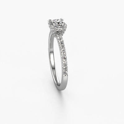 The ring shown above is called the Saskia 1 cus. We call this type of ring a pavé solitaire ring because it has one centre gemstone and a band that is also pave set with gemstones. The 14 Carat white gold engagement ring is set with a cushion 0.50 crt diamond centre stone and the band is pave set with diamond gemstones. Each jewel is made by a team of passionate goldsmiths and jewel designers. This will make your crown jewel truly eye-catching.This unique white gold pavé solitaire engagement ring has an exquisite cushion diamond centre stone. To further accentuate the centre stone, the band is fully set with more diamonds. Its open prong setting allows light to strike the diamond from various angles and this adds sparkle to your diamond ring. The photo shown above depicts the goldsmith's carefully handcrafted details of the ring. The high positioning of the centre stone is truly eye-catching. The perfect engagement ring for the crown jewel of your life! By using a combination of the latest modern techniques, combined with ancient crafting, we can make all our engagement rings in our own studio. Each jewel is made to order. This is advantageous because we can offer you a price you won't find anywhere else.Our team adds new designs to our online collection daily. Our designers and goldsmiths work together in creating the best design. We strive to offer a diverse collection of jewels. Perhaps you have a specific jewel design in mind. One you came across somewhere. Please contact us for a free consultation. We will make you an offer, based on a fair price/ quality ratio, that will baffle you.To make it easier for you, we offer a 30 day return policy. Check our terms and conditions.