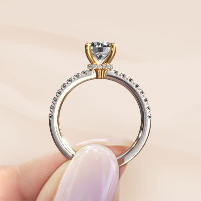 The ring shown above is called the Crystal rnd 4. We call this type of ring a pavé solitaire ring because it has one centre gemstone and a band that is also pave set with gemstones. The 14 Carat white gold engagement ring is set with a round 1.00 crt diamond centre stone and the band is pave set with lab grown diamond gemstones. Each jewel is made to shine bright around your finger. Each jewel is hand made with love by our goldsmiths.This fantasy white gold pavé solitaire engagement ring has an exquisite round diamond centre stone. To further accentuate the centre stone, the band is fully set with more lab-grown diamonds. Its open prong setting allows light to strike the diamond from various angles and this adds sparkle to your diamond ring. The photo shown above depicts the goldsmith's carefully handcrafted details of the ring. The high positioning of the centre stone is truly eye-catching. The perfect engagement ring for the crown jewel of your life! By using our modern techniques, we can design and customize the finest quality jewels with the utmost care for you. Our engagement rings are always priced 30 percent lower than other jewellers. We make engagement rings to order so we don't have to maintain a large stock. If you have a certain budget, we are more than happy to advice you accordingly.Have you found a specific engagement ring somewhere which you would like to give to your loved one? Please feel free to express your wishes to our jewel designers because we would be honoured to turn your design into a fantasy engagement ring. You can follow the development of your ring design because we use 3D drawings. This gives you a realistic preview of how your design will look. You can also preorder a dummy. A dummy is a plastic ring, which can be shaped according your ring design. You can try it on and check if its width and size are suitable for you. We will gladly send you a non-binding offer, based on a fair price/ quality ratio. It will amaze you, considering the quality of the ring and gemstones.To make it easier for you, we offer a 30 day return policy. Check our terms and conditions.
