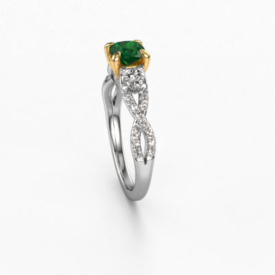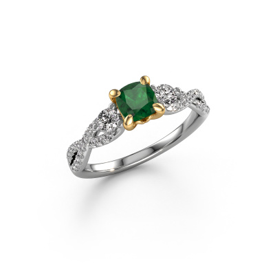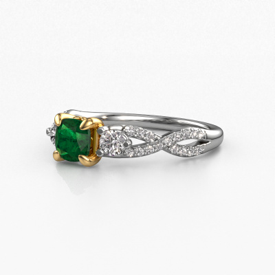 The ring shown above is called the Marilou CUS. We call this type of ring a 3-stone ring because it has one centre gemstone and a band that is also pave set with gemstones. The 14 Carat white gold engagement ring is set with a cushion 5 mm emerald centre stone and the band is pave set with diamond gemstones. Each jewel is unique in every way! Simply customize to your liking,This traditional white gold 3-stone engagement ring has an exquisite cushion emerald centre stone. To further accentuate the centre stone, the band is fully set with more diamonds. Its open prong setting allows light to strike the emerald from various angles and this adds sparkle to your emerald ring. The photo shown above depicts the goldsmith's carefully handcrafted details of the ring. The high positioning of the centre stone is truly eye-catching. The perfect engagement ring for the crown jewel of your life! By using a combination of the latest modern techniques, combined with ancient crafting, we can make all our engagement rings in our own studio. Each jewel is made to order. This is advantageous because we can offer you a price you won't find anywhere else.Our team adds new designs to our online collection daily. Our designers and goldsmiths work together in creating the best design. We strive to offer a diverse collection of jewels. Perhaps you have a specific jewel design in mind. One you came across somewhere. Please contact us for a free consultation. We will make you an offer, based on a fair price/ quality ratio, that will baffle you.To make it easier for you, we offer a 30 day return policy. Check our terms and conditions.